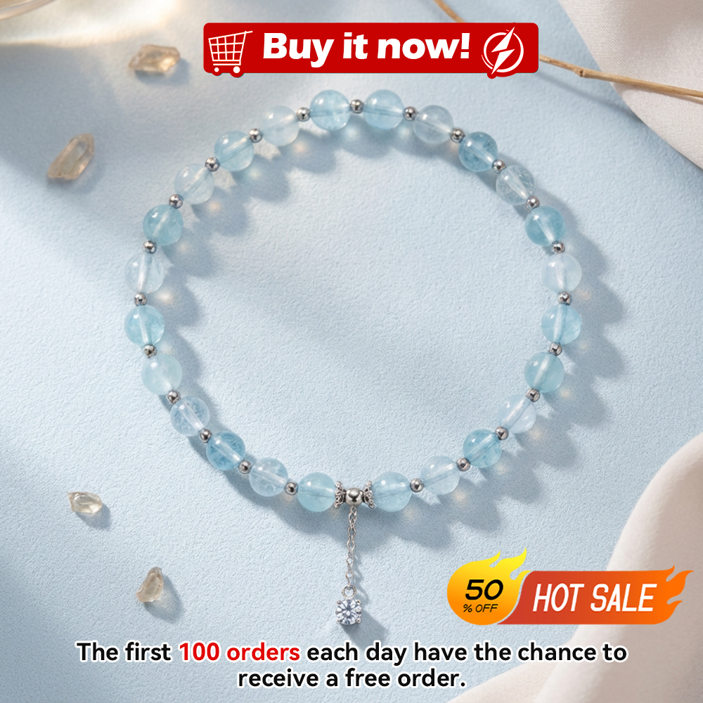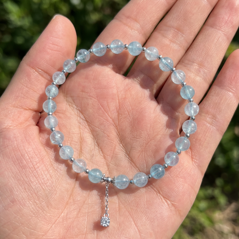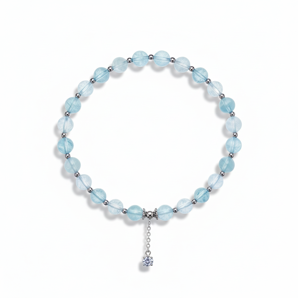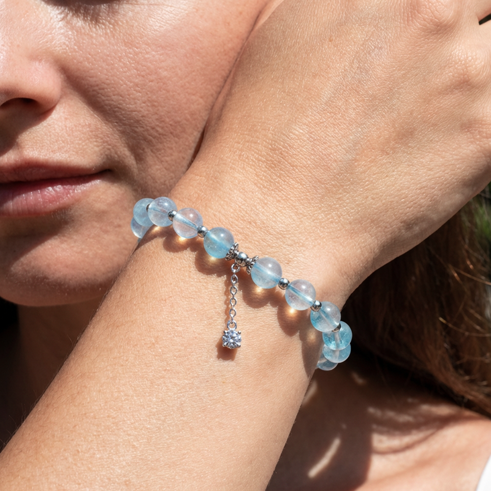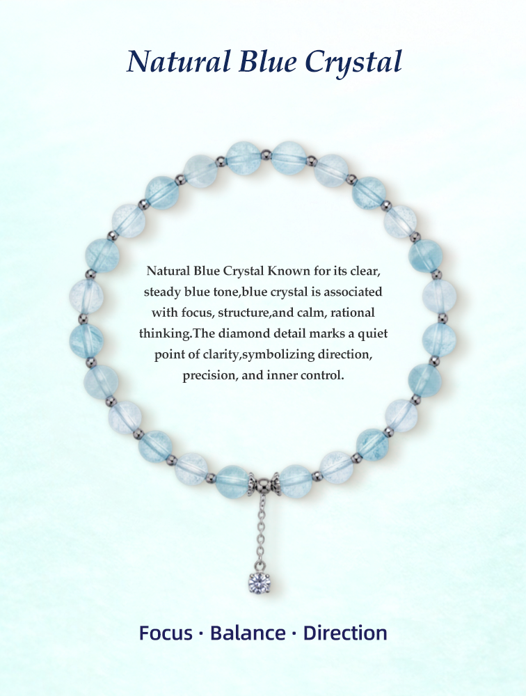 đLight-blue natural crystal beads are harmoniously paired with a delicate diamond-like tassel, adding subtle layers and movement. The glow is soft yet refined, giving the bracelet an elegant, soothing presence that feels both timeless and comforting