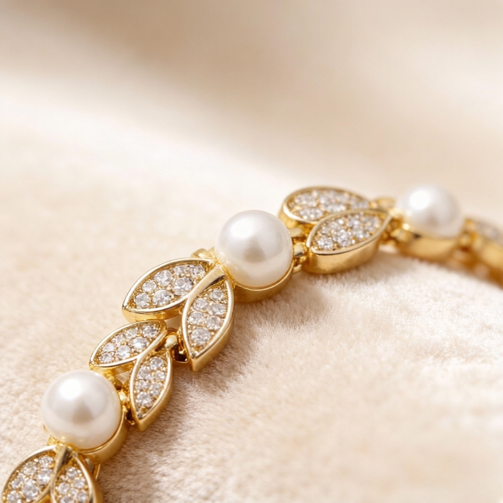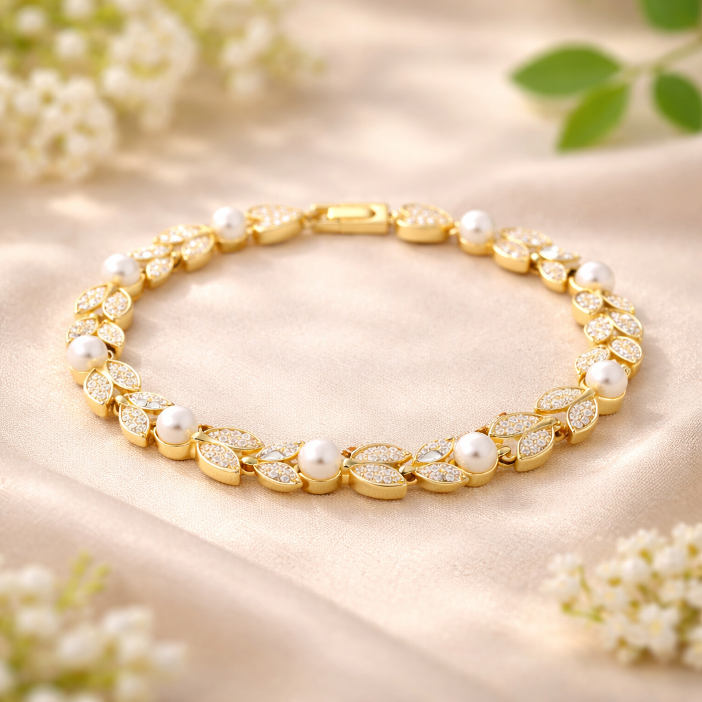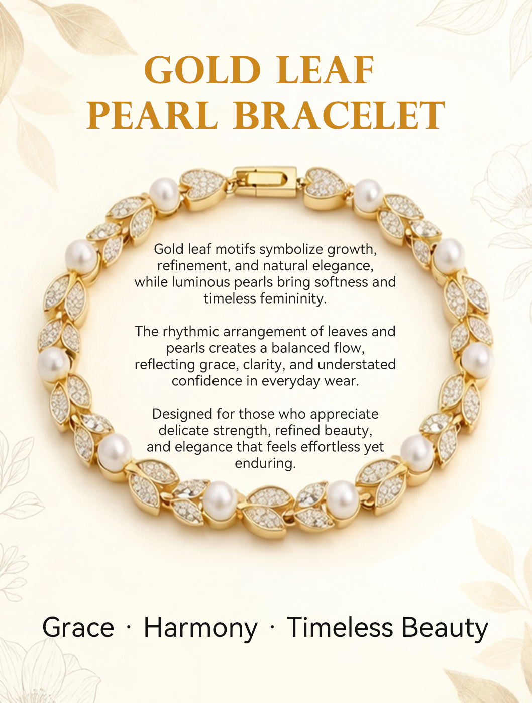 âThis gold pearl bracelet is one of the most satisfying pieces of jewelry Iâve received recently. The gold links feel solid and substantial, not lightweight or flimsy like decorative metal. Each leaf-shaped link is set with tiny sparkling stones that catch the light softly without being overly flashy. The quality of the pearls also impressed meâtheyâre nicely rounded with a smooth, natural luster and donât have a cheap, plastic-like look at all. The combination of pearls and gold leaves is very harmonious, blending feminine softness with a touch of light luxury. It looks elegant and refined without feeling old-fashioned. It fits comfortably on my wrist, doesnât pinch, and doesnât feel loose, making it easy to wear every day.