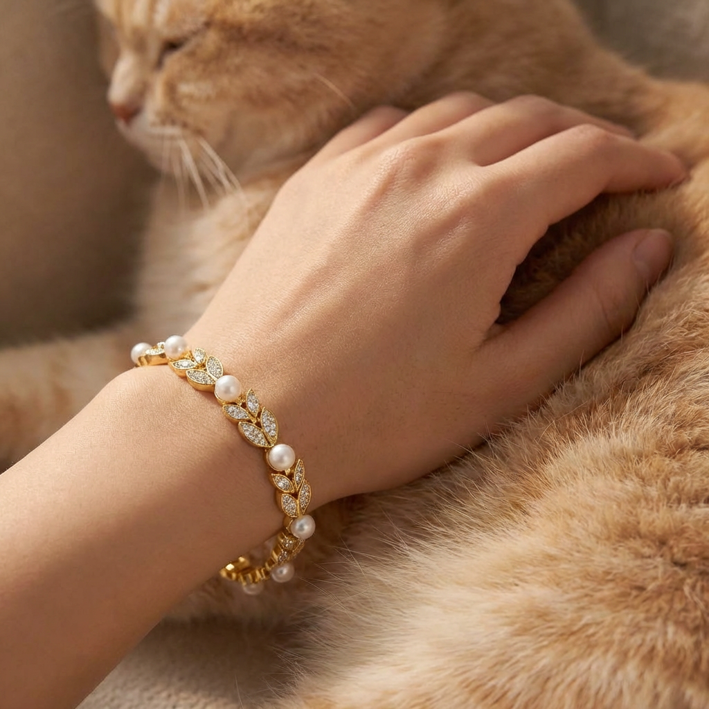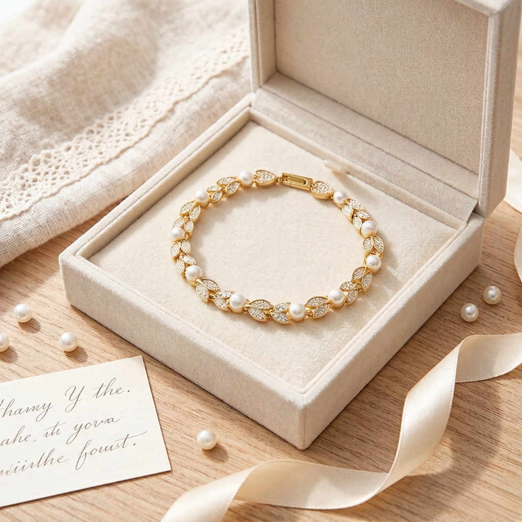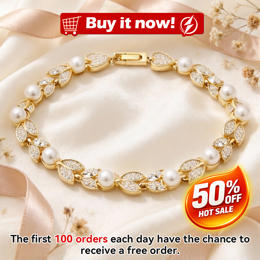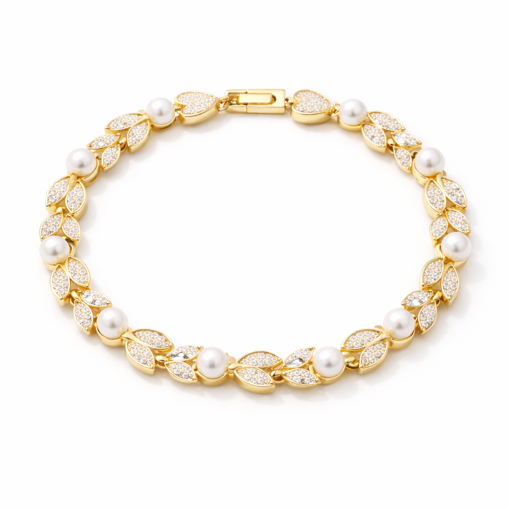 âThis gold pearl bracelet is one of the most satisfying pieces of jewelry Iâve received recently. The gold links feel solid and substantial, not lightweight or flimsy like decorative metal. Each leaf-shaped link is set with tiny sparkling stones that catch the light softly without being overly flashy. The quality of the pearls also impressed meâtheyâre nicely rounded with a smooth, natural luster and donât have a cheap, plastic-like look at all. The combination of pearls and gold leaves is very harmonious, blending feminine softness with a touch of light luxury. It looks elegant and refined without feeling old-fashioned. It fits comfortably on my wrist, doesnât pinch, and doesnât feel loose, making it easy to wear every day.