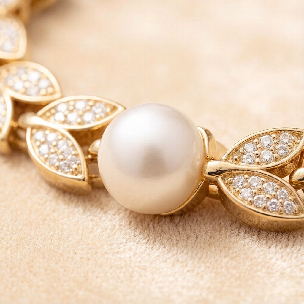 Pearls and gold elements are intricately interwoven, with gold leaf motifs inlaid with sparkling crystals, adding refinement without losing strength or presence. The bracelet naturally follows the wrist, revealing a composed, confident, and elegant feminine aura with every movement. It is a beauty that needs no explanationâquiet, assured, and deeply trustworthy.