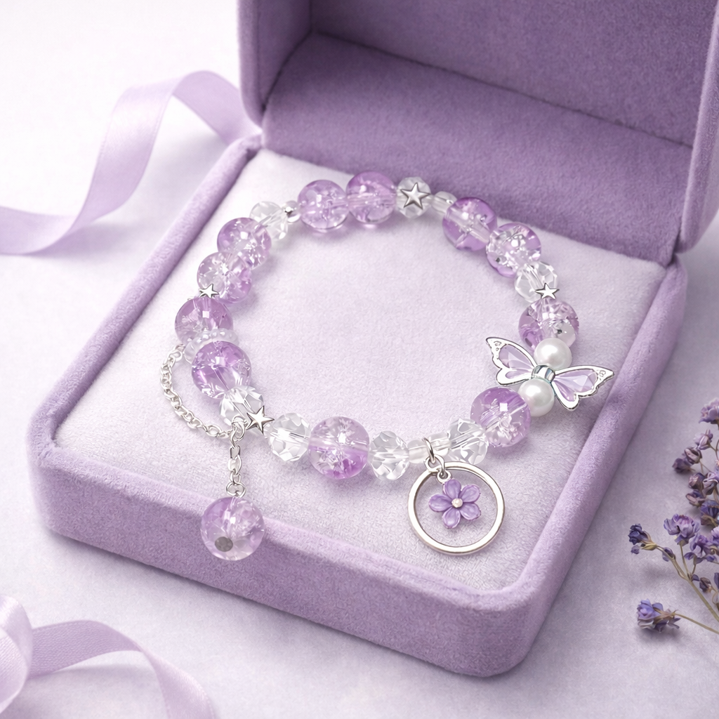 This photo was taken in a garden with really gentle sunlight. The crystals catch the light slightly on my wristânot in an attention-grabbing way, but enough to feel present on camera. The butterfly and floral details are very delicate; they donât feel childish at all, just subtly romantic. I actually got a lot of DMs asking if it was custom-made.â