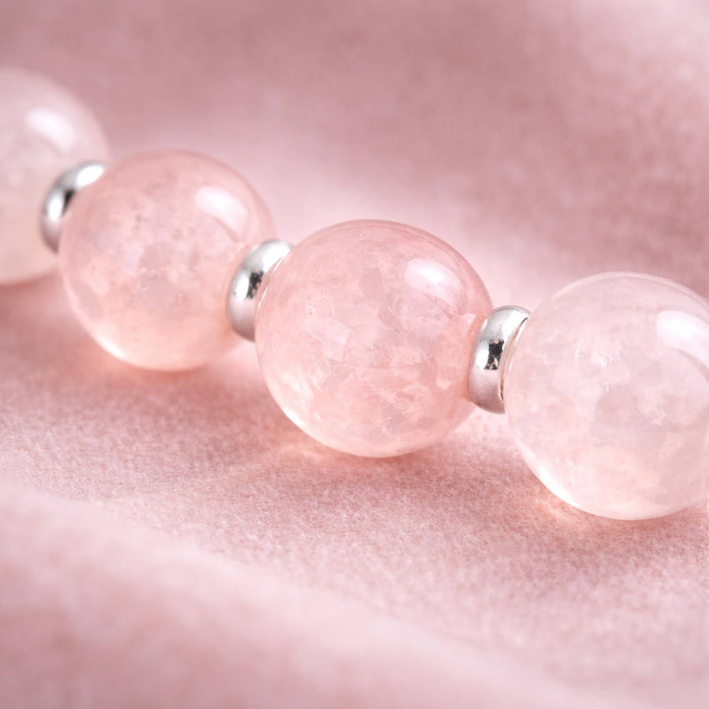 Pink crystals are strung together in a soft, rhythmic sequence, with a semi-transparent glow and delicate layers that appear calm and understated under the light. Silver spacer beads are interwoven throughout, keeping the structure clear and balancedâsymbolizing emotional energy being held and stored in an orderly way. Unrushed and non-consumptive, love and luck are allowed to accumulate slowly over time and return naturally. The central area becomes both a visual and energetic core, representing relationships and wishes gradually stabilizing and growing clearer and stronger with time.